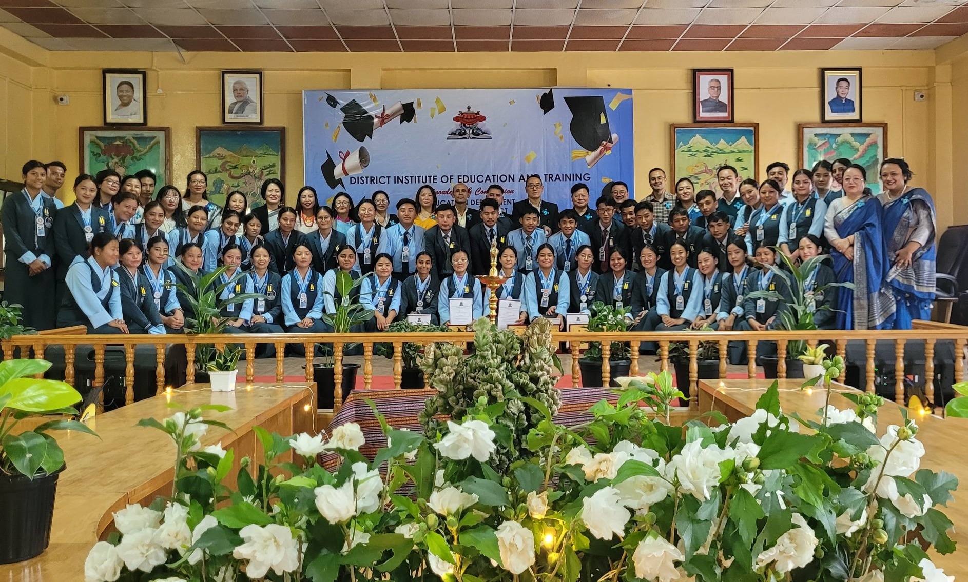 The District Institute of Education and Training (DIET), Gyalshing hosted a grand Award Day today to honour the outgoing batch of 2023–2025. The event was marked by enthusiasm, pride, and celebration as the entire DIET fraternity came together to recognize the academic and extracurricular achievements of its students. The ceremony commenced with the offering of traditional khadas and flower pots to Mr. Pema Gyalsten Bhutia, CEO, Education department, Gyalshing district as Chief Guest; Mr. Rajesh Thapa, Joint Director, Education department, Gyalshing district, and Mr. Bhim Chauhan , Principal ITI, Gyalshing district, as Special Guests; dignitaries from the education department; schools heads and representatives from various schools of Soreng and Gyalshing district where the teacher trainees had been deputed for their School Internship Program earlier; Part time language lecturers as guests. A warm welcome was extended by Mrs. Dipika Rai, the batch-incharge of the outgoing trainees and coordinator of the event. The program began with the traditional lighting of the lamp and a welcome song. A vibrant cultural presentation followed,showcasing the talent, creativity and collaboration of the trainees. The highlight of the event was self composed rhymes by all four houses of the institute. A moment of immense pride was shared when it was announced that the entire outgoing batch had passed with 100% results. Additionally, 39 out of 50 trainees successfully cleared their State Teachers Eligibility Test(STET) while undergoing their course in third semester, a remarkable achievement for the institution. The Principal, in her address, expressed deep appreciation for the batch, declaring as the ‘Best Batch’ the institution has seen in recent years , not only for academic excellence but also for their discipline, dedication, unity, and active involvement in all institutional activities. The following awards and certificates were presented to acknowledge outstanding individual performances : Best Cultural Performer : 1. Dewnee Hangma Limboo 2. Selimit Lepcha Best sportsperson : 1. Eshmile Tamang 2. Nirmala Chettri Best Attendance: 1. Sayoja Limboo 2. Kajal Bhujel Highest Scorer: Birina Gurung Best disciplined trainee : Sangdup Lepcha All Rounder Award : Rebum Lepcha The Chief Guest delivered an inspiring speech, emphasising the vital role of dedicated and passionate teachers in shaping the future of education and society The event concluded with a vote of thanks by the Mrs. Matrika Thapa , which was followed by refreshments and group photographs to commemorate the occasion. The Award Ceremony not only celebrated the accomplishments of the outgoing batch but also inspired the current and future trainees of DIET to strive for excellence towards their journey of becoming an educator.
